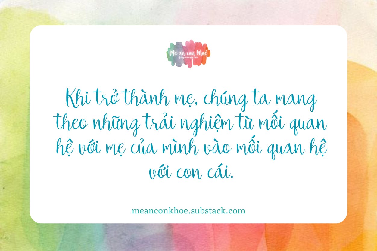 Khi trở thành mẹ, chúng ta mang theo những trải nghiệm từ mối quan hệ với mẹ của mình vào mối quan hệ với con cái.Những vết thương từ quá khứ có thể trở thành nguồn cơn cho những lo lắng, sợ hãi hoặc thậm chí là những hành vi mà ta không mong muốn khi làm mẹ.